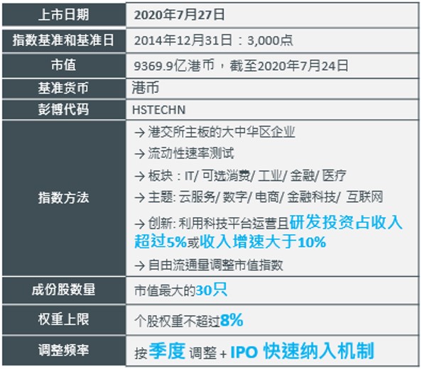 恒生科技指数由恒生指数公司于2020年7月27日推出,代表最大30家与科技主题高度相关的香港上市公司,业务涉及网络 (包括移动通讯) 、金融科技、云端、电子商贸或数码。恒生科技指数的推出引起了市场的广泛关注,被市场推崇为“东方纳指”。