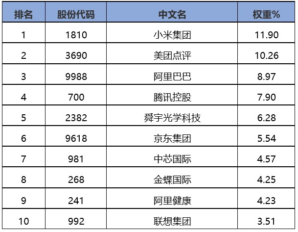 南方东英恒生科技指数ETF(3033.HK)采用全面复制策略、追踪恒生科技指数。截至2020年9月1日,该ETF的前十大成份股为:
